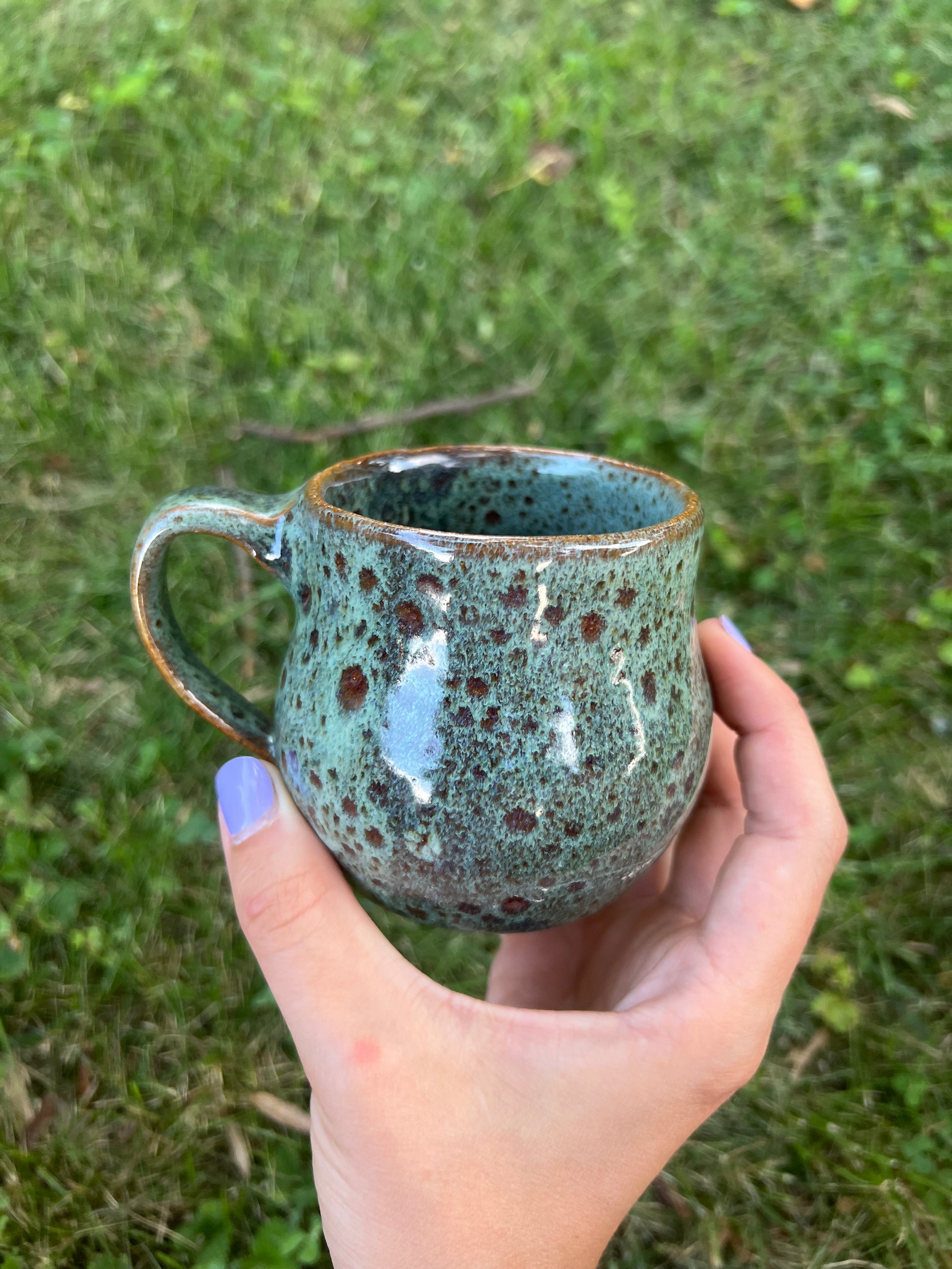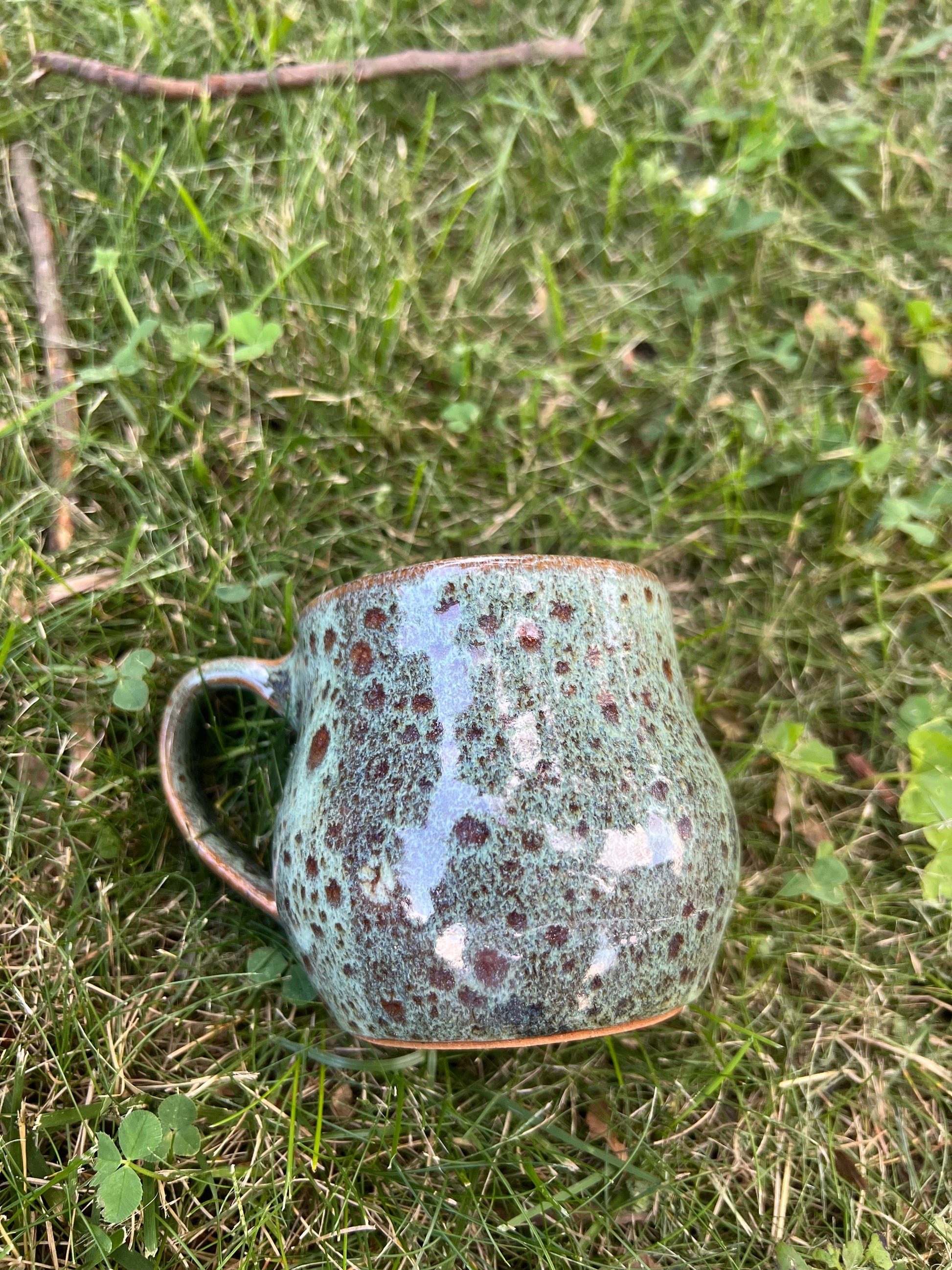 A curvy mug, with variations of browns and blues. Holds 8oz of liquid with a 1 1/2in hold for the handle.