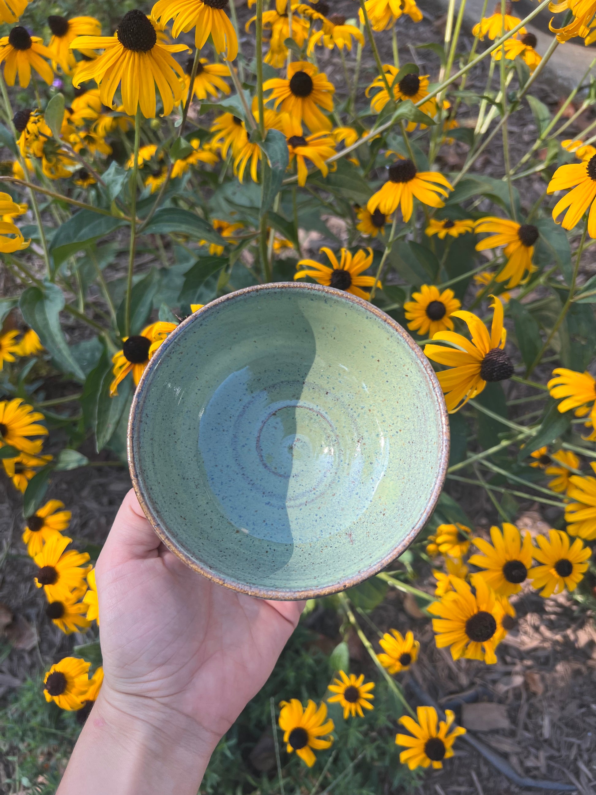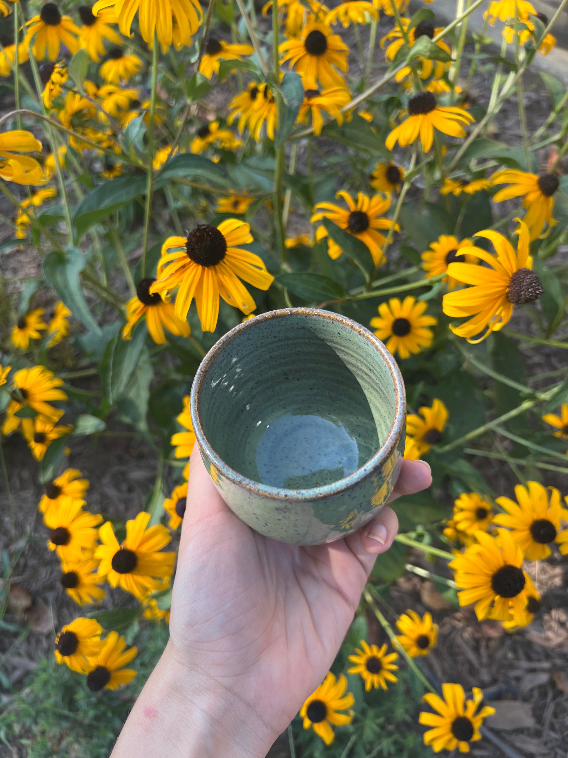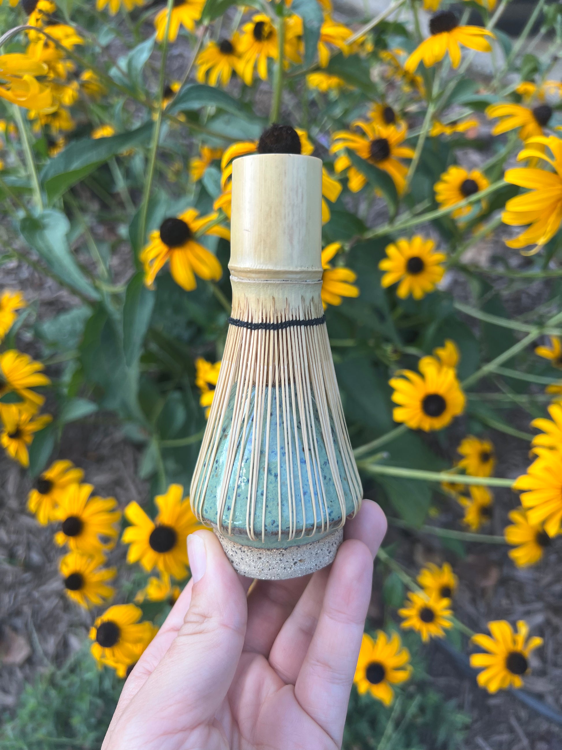 Green speckled glaze, on a brown clay body. A three-piece set, Including a bamboo whisk holder, bowl and cup. (Whisk not included)